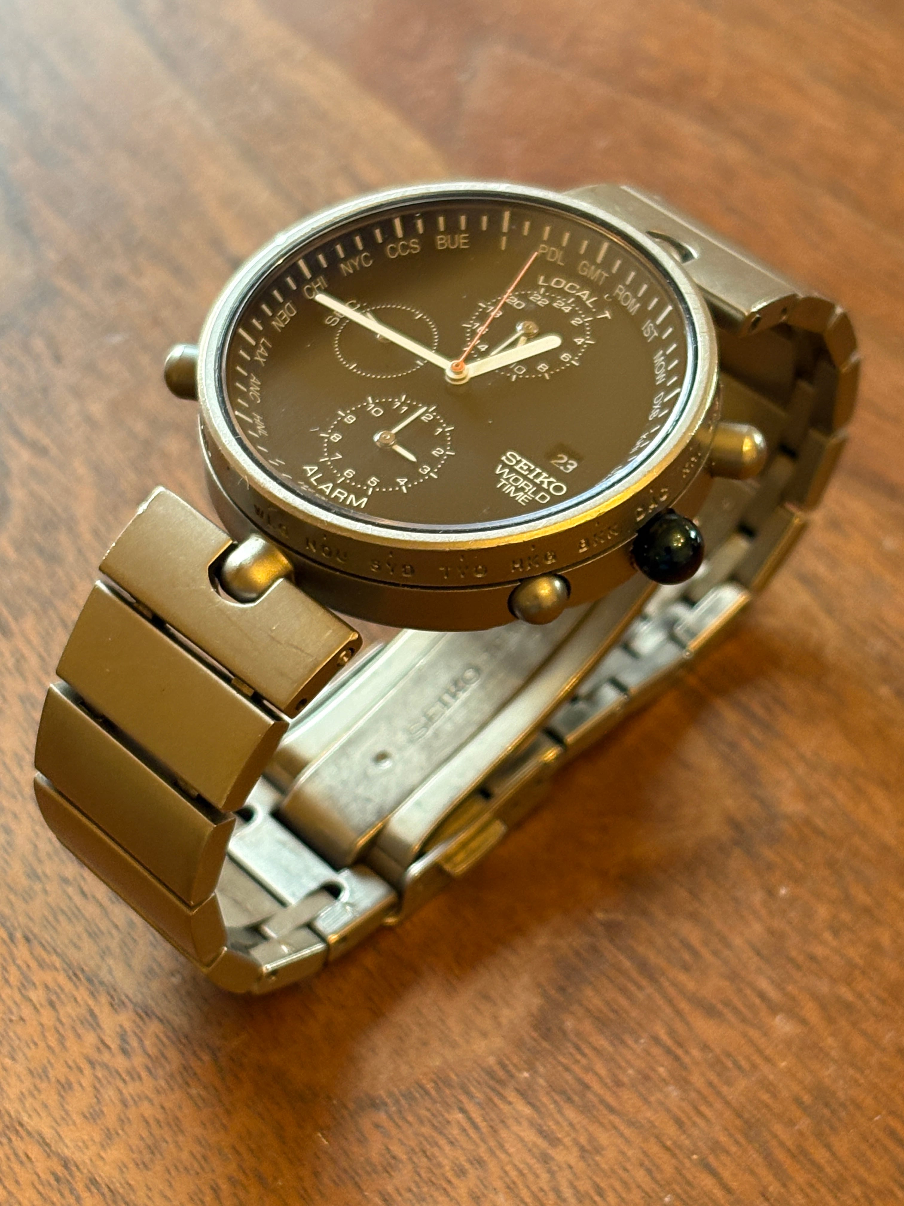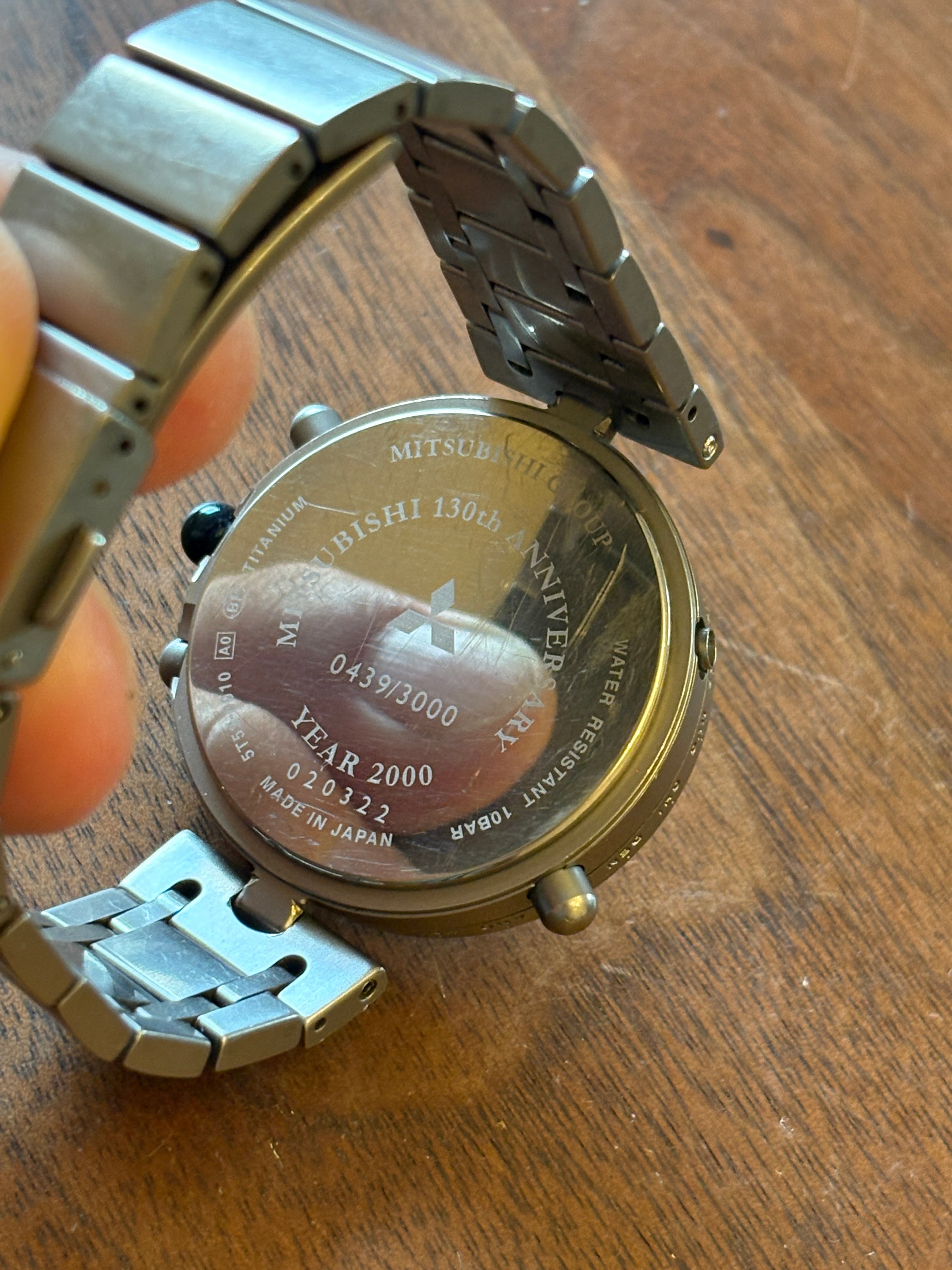 This is an extremely valuable wristwatch that Mitsubishi commissioned Seiko to make in a limited edition of 3000 pieces to commemorate the millennium. I think it was distributed to group employees. It is written in Urabuta. It's an extremely excellent design. Even now, it looks very cool, modern and beautiful. It is working normally. Condition is also good. The length of the belt is approximately 19cm. One of the upper left push buttons is missing. That's why the price is so low. It's quite a bargain.