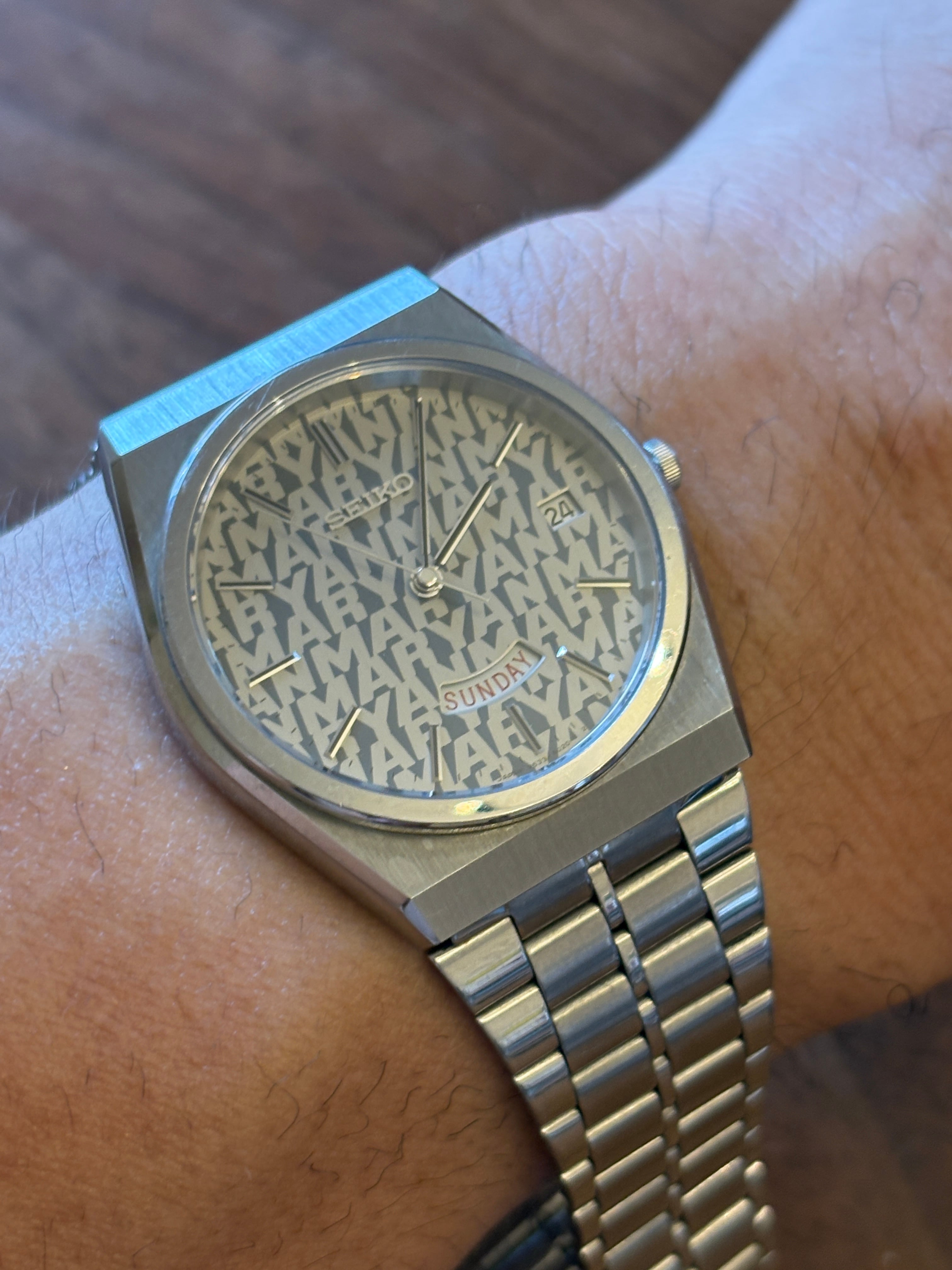This is a Seiko watch made by Yanmar. 25 years of continuous service with Yanmar is written on the back cover. It is a very valuable watch given to a person who worked at Yanmar for more than 25 years quite a long time ago. I will never get it again. The dial is filled with Yanmar. This wristwatch is given only to those who have worked at Yanmar for more than 25 years. It is a substitute that is rarely found in Japan. Very valuable. It works fine .